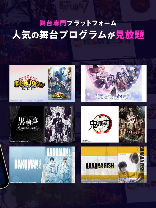 舞台やミュージカルをはじめ、キャストによるライブ配信やここでしか見られない独占プログラムを、お手持ちのスマホ、タブレット、パソコンで楽しめる、舞台専門プラットフォームです。