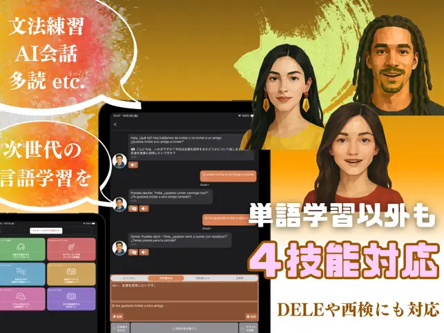 AI添削、SRS自動復習、イメージ絵文字で暗記&語彙力強化。DELE・スペイン語検定(西検)やSIELE、大学入試・第二外国語対策に最適。リスニング・ライティングもサポートし初心者から上級者まで無料で効率よく学習可能!