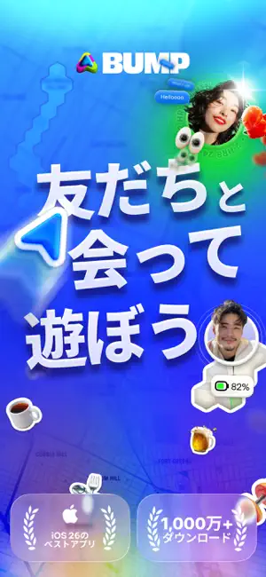 ・行った場所を自動的に検出し、あなただけのマップを作成 ・場所を検索して、友達が行ったことがあるかを確認したり、そこまでのルートを表示させたり、保存もできる ・今、友達がどのバーにいるのか、もしくは家・職場・学校にいるのかリアルタイムで確認 ・学校に参加して、参加している生徒やサークルを確認 【チャット】 ・テキスト、ステッカー、画像、動画、GIFを新しいチャットに投稿 ・マップから個人チャットやグループチャットを開始 ・同じタイミングでチャットにいる友達が見れる。そして、そこに感じる! ・これはアートです。普通のチャットはせずに、あなたのクリエイティビティを発揮して 【スクラッチ マップ】 ・あなたが行ったすべての場所を自動的に記録し、あなただけのスクラッチ マップを作成。スマホはポケットに入れたままで大丈夫 ・友達と競争して、あなたの近所を100%塗りつぶそう ・あなたが宿泊した場所と一緒にいた人を記録 【ナビゲーション】 ・友達またはApple マップ上の場所までのルートを確認し向かう。Uberタクシーを呼ぶこともできます ・現在の到着予定時刻を友達のロック画面にシェア ・Buzzを鳴らして、近くに来たことを友達に知らせる 【その他】 ・あなたの写真や動画はステッカーにして好きなだけ送る ・友達が海外旅行をしたり、州を超えた時に通知を受け取る ・ゴーストモードを使って、一時的にマップから消える ・ホーム画面にウィジェット追加して、友達が今何をしているのかすぐに確認 ・iPhoneを持っていない友達とも使えます! ・Siriとショートカットに対応 ・無料アプリ ・その他の機能も今後、追加予定! BumpはApple、TechCrunch、Business Insider、Highsnobiety、Wiredなど多数のメディアで特集されました。皆さんがBumpを愛してくれているように、きっとあなたも気に入るはずです。 質問や機能リクエスト、限定グッズについてはInstagramのDM(@bumpbyamo)でご連絡ください。