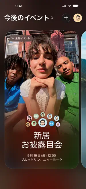 ユニークな招待状を作成して、心が躍る瞬間をみんなで一緒に楽しみましょう。招待状の背景をライブラリ内の写真でカスタマイズしたり、イベントを生き生きと演出する絵文字の背景を選択することもできます。参加者を手軽に確認できる上、共有アルバムをアプリからイベントに直接追加することで大事な瞬間を逃さず楽しめます。イベントに参加する場合でも、主催する場合でも、“インビテーション”を使えば簡単にパーティーを始められます。