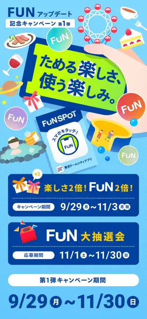 ・東京ドームシティ敷地内で1日1回チェックインするとFUNがたまります。