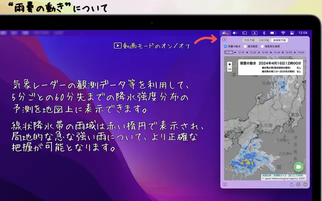 メニューバーからすばやくアクセスでき、天気予報の発表時刻に合わせて予報表示を自動更新しま‏す‎。