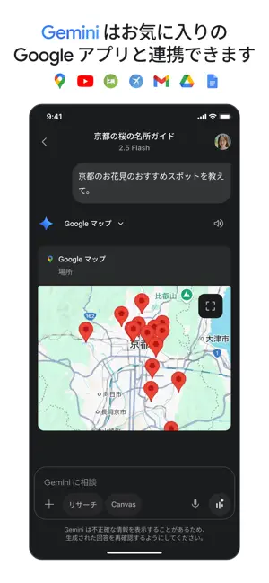 - Gemini と Live で話して、複雑なトピックを簡潔にまとめたり、大事な面接のリハーサルを行ったりできます。Gemini アプリで Gemini Live ボタンをタップするだけです。 - Google 検索、YouTube、Google マップ、Gmail など、お気に入りの Google アプリと連携できます。 - 会話を通じて画像や実例を確認しながら効率よく学習し、さまざまなトピックについて調べることができます。 - さまざまなファイルをポッドキャストに変換して、いつでもどこでも聴くことができます。 - 短い指示文で、魅力的な画像を生成できます。 - 短時間で効率よく旅行の計画を立てることができます。 - 要約、詳細分析、出典情報をすべて 1 か所で確認できます。