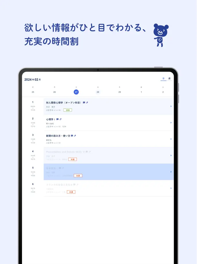 時間割と課題の見える化できるのって本当にいい機能だと思う。(休講や振替の時間割表記もちゃんとしてくれてるし)
