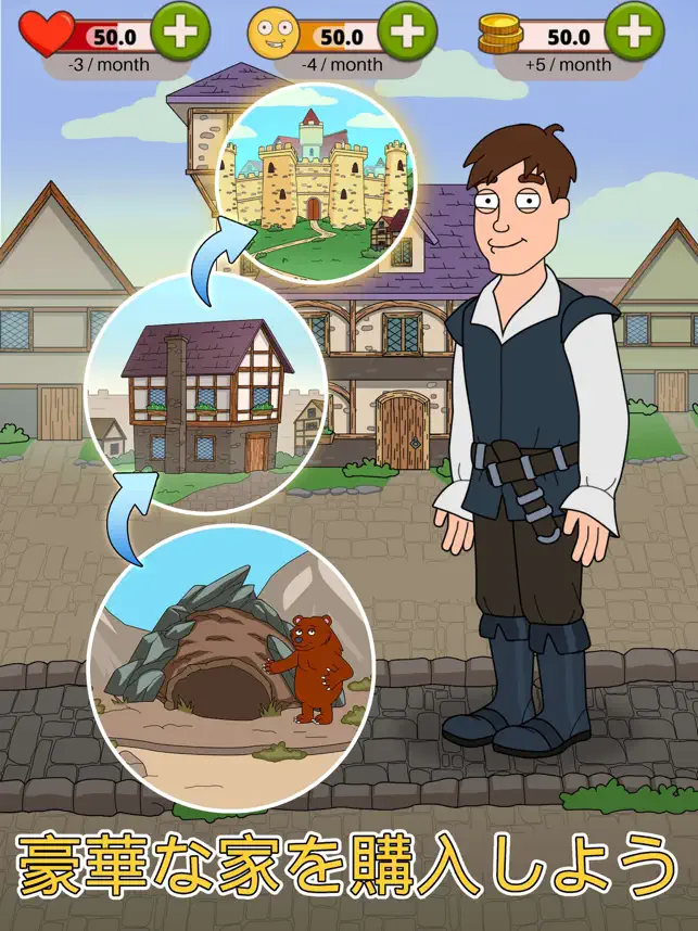 王国で最も裕福な男になりましょう。健康、お金、幸福の指標を追跡し、100 年間生きましょう。浮浪者を王様の人生に導きましょう。