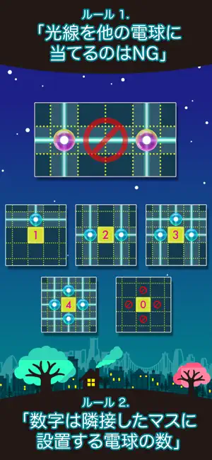 空いてるマスに電球を設置し、全てのマスを光で照らすとクリア!