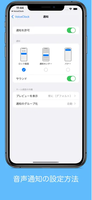 以上の設定でバナー無しの音声のみに通知になります。