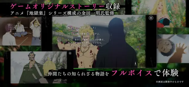 アニメ『地獄楽』シリーズ構成の金田一明氏監修、すべての仲間にフルボイスの完全新規オリジナルストーリーあり。