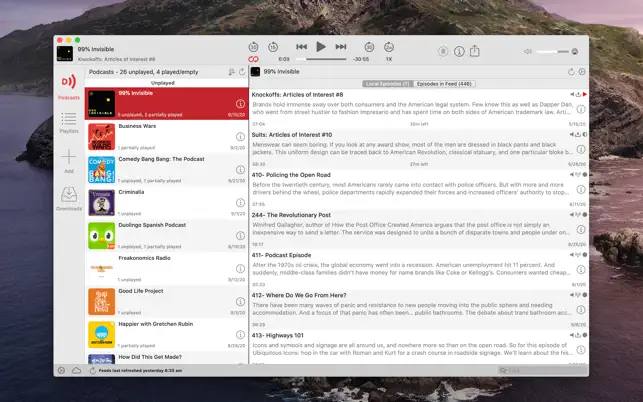 Downcast, the popular iOS podcast app is now available for OS X! Download, play and sync** your favorite podcasts with an intuitive interface built specifically for podcasts.