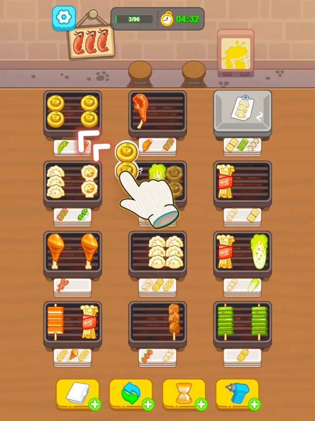 遊び方は超簡単!軽くタップして巧みに動かし、同じ種類の串焼きを3つお皿に並べるだけで、グルメが一瞬で消去し、スコアがどんどん増えます!