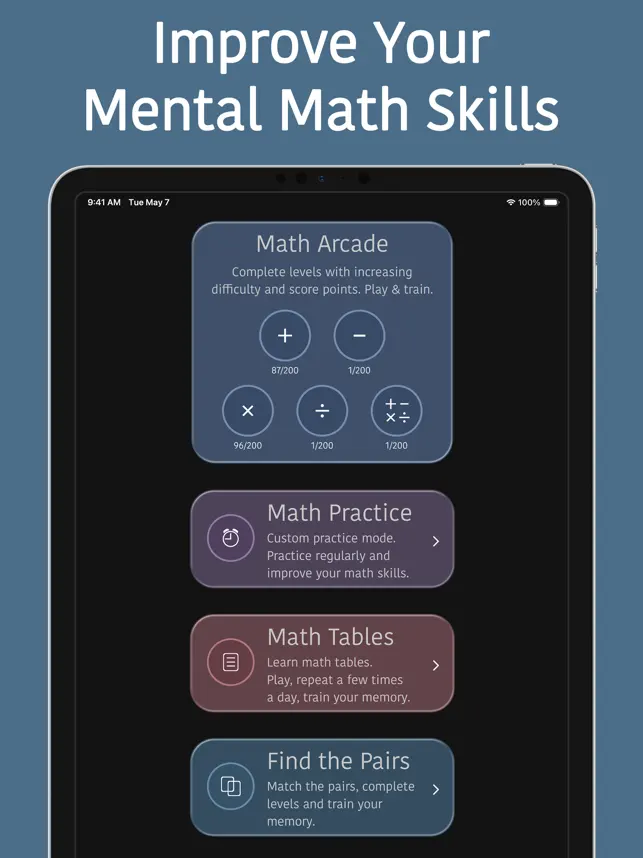 Learning math tables has never been easier. Play Math Tables, repeat a few times a day, and train your memory. Multiplication tables, times tables, brain games, addition games, and more.