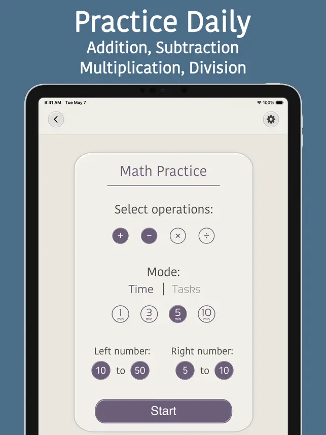 Math Practice mode in Mental Math Addition Games - Pure Math allows you to create custom practice sessions depending on the operations you wish to train. You can also select custom practice duration, difficulty level, and custom numbers. Math games where you solve math problems and a great way to give your brain a workout and improve your cognitive function.