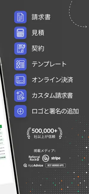 プロフェッショナルな請求書、見積書、領収書を、どこにいても簡単に作成・送信できます!フリーランサーや成長中の企業が、顧客訪問中に瞬時に書類を作成できる最適なツールです。