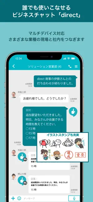 「direct」は、立って働く現場をお持ちのお客様のコミュニケーションツールとして国内で開発しているビジネスチャットです。