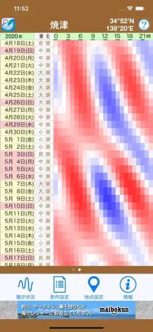 条件の設定次第で海釣り、サーフィン、潮干狩りなどに最適な日を教えてくれま‏す‎。