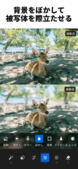 * 背景をぼかす: ぼかし(レンズ)で、写真の背景を調整して、簡単に深みとフォーカスを加えらえれます。