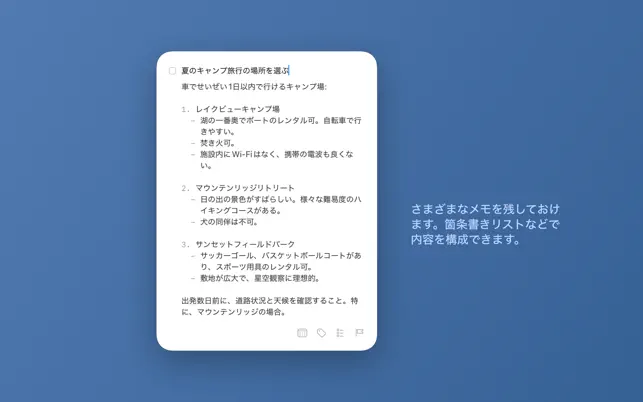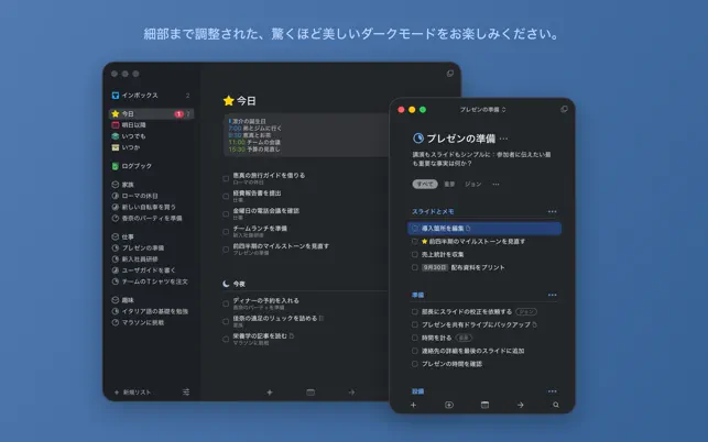 パワフルな“To-Do”機能は基本です。小さな一歩が大きな成果につながります。メモやタグを追加したり、スケジュールすることはもちろん、より詳細なステップに分けることもできます。