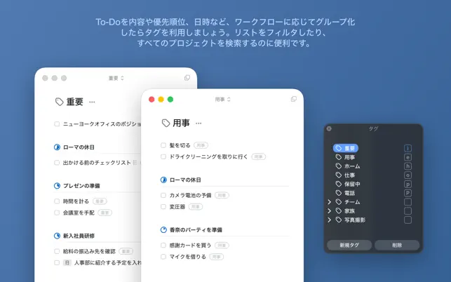• タグ — To-Doをカテゴリーに分類して、すばやくリストをフィルタ。
