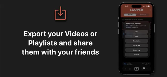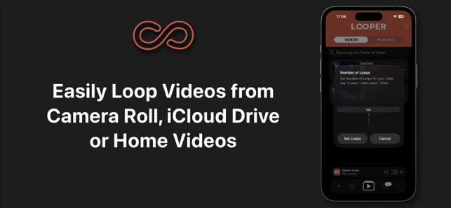 Looper is the only App that lets you repeat videos on your iOS devices or on an external screen infinitely and export a playlist of your favorite videos with a number of repetitions.