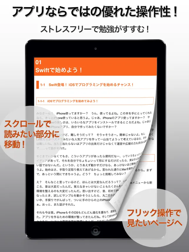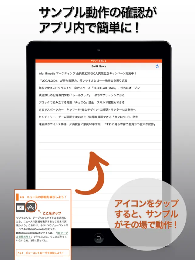 この本は、最初は紙で出していて、これが電子版ってことになる。電子版ならKindleやiBooksで出すこともできたんだけど、あえてアプリにしてみた。なぜか? それはプログラミングの本だから、ならではの機能を入れたかったんだよね。たとえば、本文の表示は画面の縦横に追随するリフローだから、1行が長いソースコードも横向きなら読みやすくなる! あと、サンプルのアプリがいくつかあるんだけど、それが本の中で起動できる! 本文の中にアプリボタンがあって、それを押すとモーダルビューの中でアプリが動くんだ。さらに、Xcodeの操作などを収めたムービーも表示できる! ムービーを見ながら本文を読めるんだ。