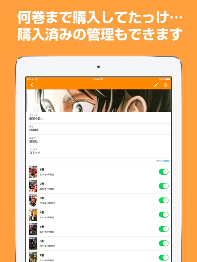 - すごく使いやすい!ただちょっと問題も… 今までのコミック新刊管理アプリで一番使いやすいです!特にシリーズごとに一括選択できる、感想を書かなくても良いなどがわたしにはちょうどいいなと思いました。 ただそれだけに残念な点が2点… ・楽天ブックスのAPIを用いてるとのことで、検索で出てこない本があり、手動で追加することもできない ・これはエラーだと思うのですが、一部本で検索結果から本の詳細ページへ移行できず、読み込み中のままフリーズしてしまう(白泉社・集英社系でうまくいきません、巻数が多いのが原因か出版社が原因かはわかりませんが、、、) また、こう言った機能もあるとさらに便利だなと思いました ・Kindle、DMM、シーモアなど、複数の電子書籍サイトで購入してしまった本を一元管理できるように、各サイトから同期させられる