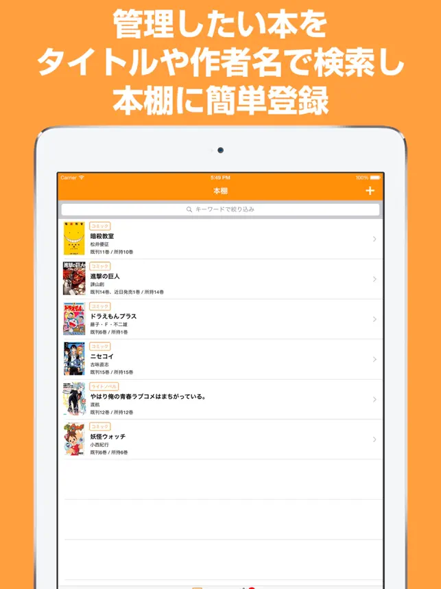- シンプルでちょっと物足りない 間違えて同じ巻を買ってしまうことや、買い忘れて抜け巻があったりするのでインストールしました。バーコード登録はできませんが、本棚に作品を登録すれば、以降はシリーズごとに一気に購入登録出来るので楽チン。他のアプリは1冊1冊登録する必要があるものが多いのでここはストレスフリー。ただ、シリーズものでもタイトルに表記揺れがあると、別シリーズとしていくつかに分かれていたり(D.Graymanは1〜24巻と25〜26巻で別シリーズ扱いされてました。)、マイナーだとシリーズものだと認識されていないので手動で登録し直す必要あり。巻数が多いとちょっと面倒です。また、タイトルの表記を編集して統一しようとすると、シリーズの並びがバラバラになりました。タイトル名に関わらず、発売日順に並べる機能があるといいのですが。今のところ手動で並び替えるしかなさそうです。気になる点もありますが、シリーズごとに本棚に登録されるので、本棚がごちゃつきません。本棚からタイトル検索もでき、既刊何巻、購入何巻もパッと本棚から確認できるので、これからは本屋さんで迷わず購入出来そうです。
