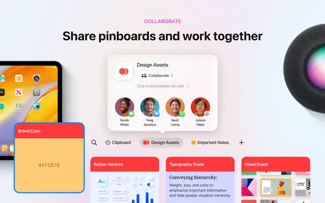 Turn your clipboard into a space for collaboration — work together without giving up control. – Granular access control: choose what to share and what to keep private – Collaborate on research, project materials, or inspiration – Stay in sync with your team while staying focused on your flow