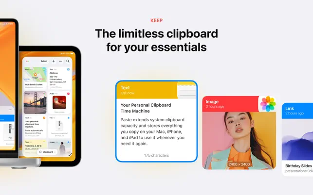 Paste stores everything you copy on your Mac, iPhone, and iPad — so it’s always there when you need it. From text and links to images and files, Paste saves it all. Just copy once, and Paste takes care of the rest.