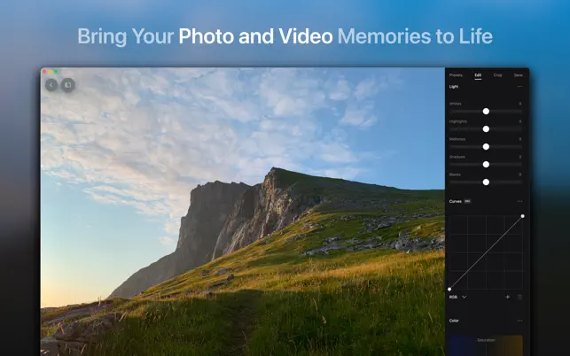 • Curves & RGB Curves • Saturation & Temperature • Color grading • Hue, saturation and luminosity color controls • Clarity, sharpen, emphasize and noise controls • Vignette • Crop