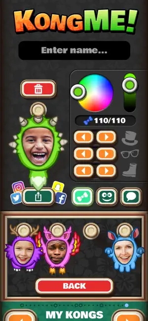 自撮り写真を撮って、自分自身のコングを作成することもできるように!君の友達や家族をコングにして、楽しいアクセサリーでドレスアップさせよう!数千もの組み合わせが利用できるよ!