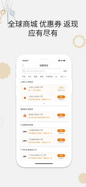 目的地商城:20余个热门旅游国家、50余个免税店和商场全覆盖!日上免税店、新罗免税店、乐天免税店、泰国皇权免税店、友都八喜、老佛爷、梅西百货、奥特莱斯…打折信息、折扣价格、优惠券、机上免税、环球蓝联/联合货币兑换…你想要的都在这儿!