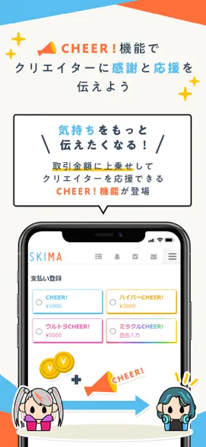 ■安心の取引システム 4ステップで取引が行われるので、購入者・クリエイターが料金や作品を持ち逃げされるリスクを軽減し、安全安心にお取引ができます。 ①クリエイターに相談・商品購入申請 ②取引開始後にお支払い ③制作過程でクリエイターとやり取りしながら作品が完成するまでやり取り ④双方問題なければ納品完了、この時点で料金をクリエイターへお支払い 「CHEER!」機能を使って、クリエイターを応援できる! ※取引中増額機能、取引期間延長機能が追加されました。 ※購入者の方も取引するにあたって電話番号認証が必須になりました。