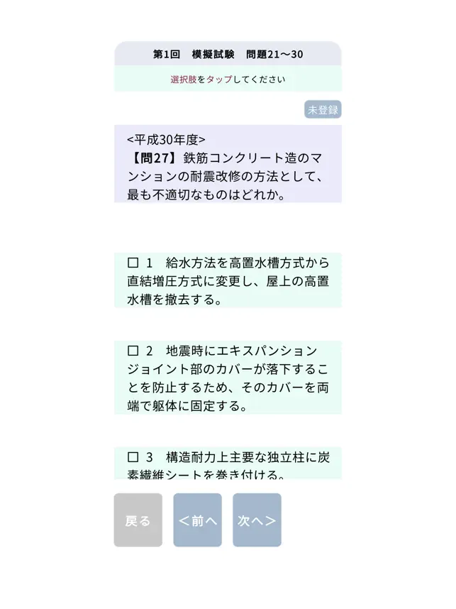 ?有料問題の追加や会員登録はありません。 ?試験形式で解答・採点・集計を行います。 ?未解答・不正解問題のみの表示・解答ができます。 ?重要問題を登録できます。 ?過去問をシャッフルした模擬試験を毎月配信します。 ?WEB版無料AIの簡易的利用が可能です。 [ 一覧に戻る ] ※タイトルロゴをタップしても戻れます。 |
