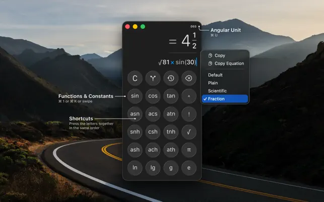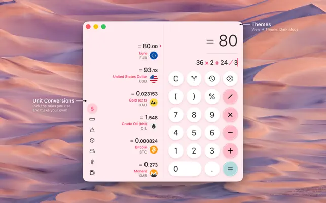 Mac、iPhone、iPad、およびApple Watch向けの電卓。シンプルなインターフェースで、ダークとライトのテーマが利用可能。完全に編集可能な計算式フィールド。履歴はすべてのデバイスで同期されます。パーセンテージ、べき乗、様々な機能が備わっています。広告は一切ありません。