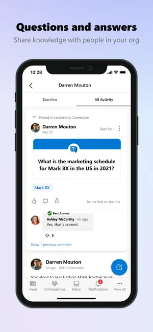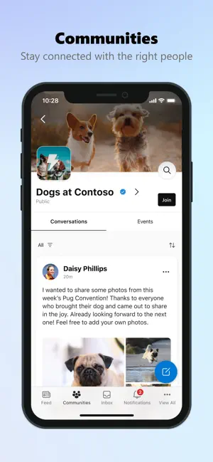 Viva Engage は、リーダーや同僚とのつながり、自己表現、知識の共有や発見、自分にとって重要な組織全体のコミュニティへの参加に役立ちます。Viva Engage アプリを使用すると、外出先でも情報を入手したり、連絡を取ったりすることができます。iOS 用の Viva Engage (旧称 Yammer) では充実したモバイル デザインで同じ機能を利用できます。